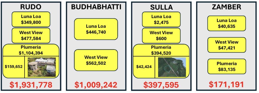 Plumeria at Waikoloa, which acquired 11.8 acres from a developer at a steal with Rudo’s help and later sold it for $1.5 million, was co-owned by Rudo, Sulla, and Zamber. Plumeria was later renamed Peaceful Ventures. Rudo was the majority owner through his company Dezign Artz (then later via two trusts benefitting him), and Sulla and Zamber owned the remainder through their company SZ Ventures, in which Sulla was the majority owner.